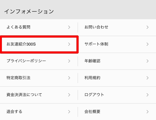 お友達を紹介する場合は、ホーム画面一番下「インフォメーション」の「お友達紹介300S」からLINE、メールを送信してください。